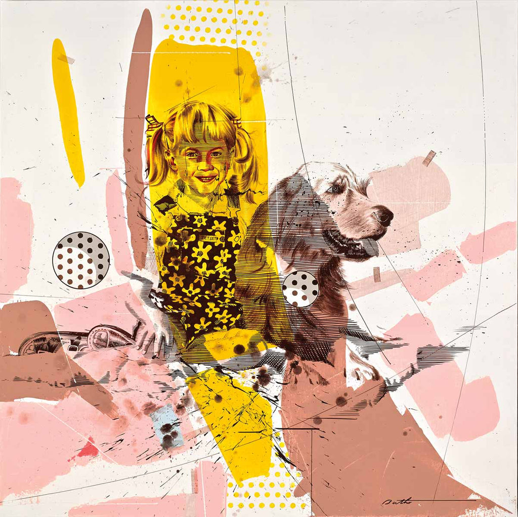 "Marguerite Gonzales et son chien" is an acrylic on canvas painting created by Philippe Bertho in 2014. The artwork is signed 'Bertho' lower right. The canvas size is 39.25 x 39.25". The artwork ships framed. Please contact the gallery regarding available frame options.