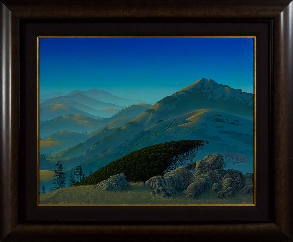 "Nature's Jewels" is an acrylic and alkyd on canvas painting created by Bruce Ricker in 2000. The artwork is signed 'RICKER 2000' lower right. The canvas size is 22 x 28" and the artwork is framed in a contemporary black frame. The artwork ships framed.