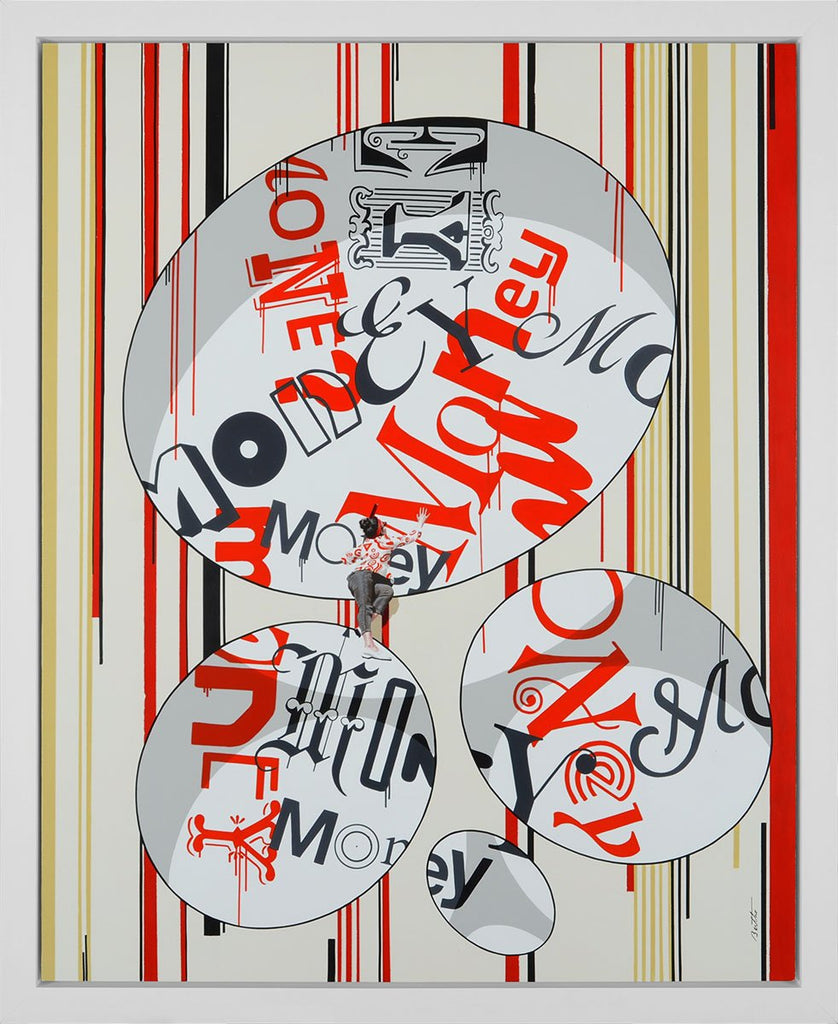 "Money n°1" is an acrylic on canvas painting created by Philippe Bertho in 2017. The painting is signed 'Bertho' lower right vertical. The canvas size is 39.5 x 32" and the artwork is framed in a contemporary white frame. The artwork ships framed.