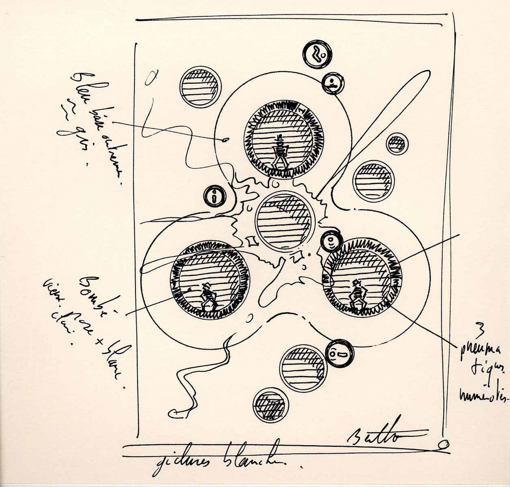 "Untitled #70" is a pen on paper drawing created by Philippe Bertho in 2013. This drawing is the original pen and ink study for a larger painting created in the same year. The drawing is signed 'Bertho' lower right. The image size is 6 x 6" and the artwork is framed in a contemporary gold-tone frame. The artwork ships framed.