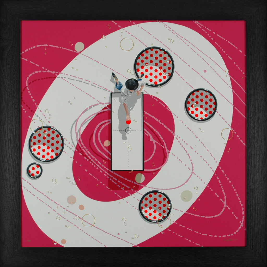 "Focus (Mise au Point)" is a serigraph on linen created by Philippe Bertho in 2007. From the edition of 237, the artwork is signed 'Bertho' lower right and annotated lower left. The canvas size is 34 x 34" and the artwork is framed in a contemporary black frame. The artwork ships framed and accompanied by a certificate of authenticity.