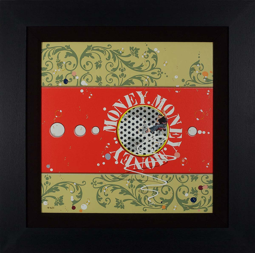 "Money (Red)" is a serigraph on linen created by Philippe Bertho in 2007. From the edition of 237, the artwork is signed 'Bertho' lower right and annotated lower left. The canvas size is 21 x 21" and the artwork is framed in a contemporary black frame. The artwork ships framed and accompanied by a certificate of authenticity.