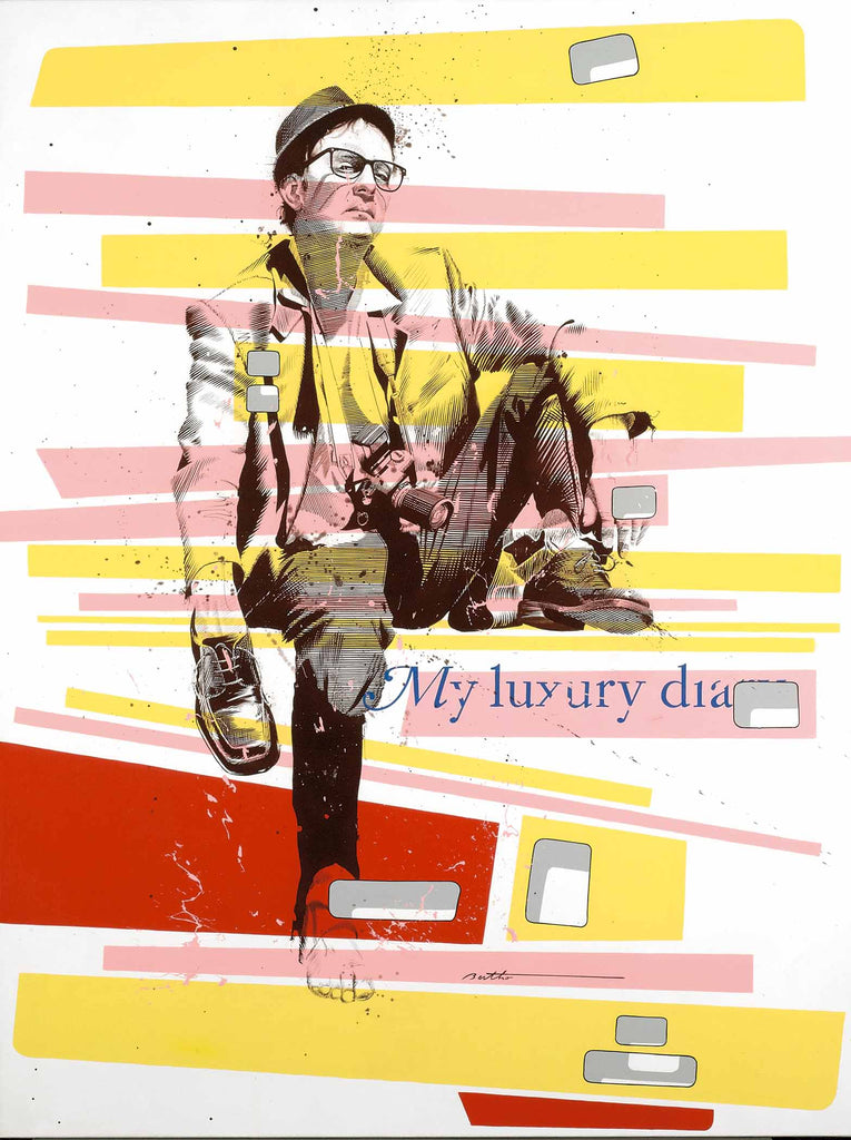 "Commandant Couchetôt" is an acrylic on canvas painting created by Philippe Bertho in 2012. The artwork is signed 'Bertho' center right. The canvas size is 51 x 38" and the artwork is framed in a custom, closed-corner, gold leaf frame. The artwork ships framed.