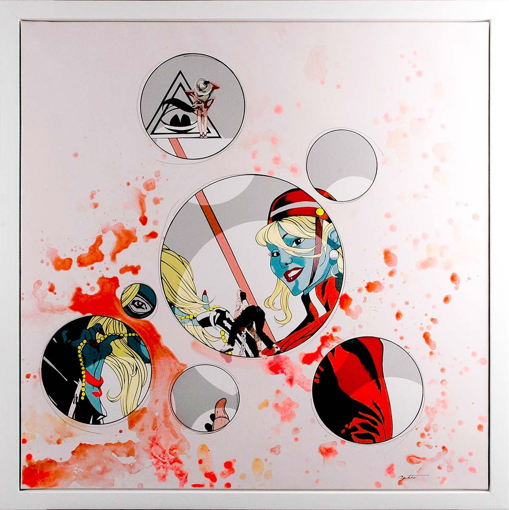 "L'homme aux chaussures blanches" is an acrylic on canvas painting created by Philippe Bertho in 2016. The painting is signed 'Bertho' lower right. The canvas size is 39.25 x 39.25" and the artwork is framed in a contemporary white frame. The artwork ships framed.