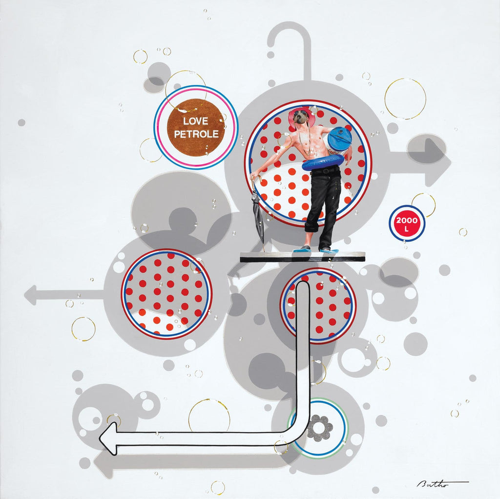 "Love Petrole 1" is an acrylic on canvas painting created by Philippe Bertho in 2010. The artwork is signed 'Bertho' lower right. The canvas size is 27.5 x 27.5". The artwork ships framed.