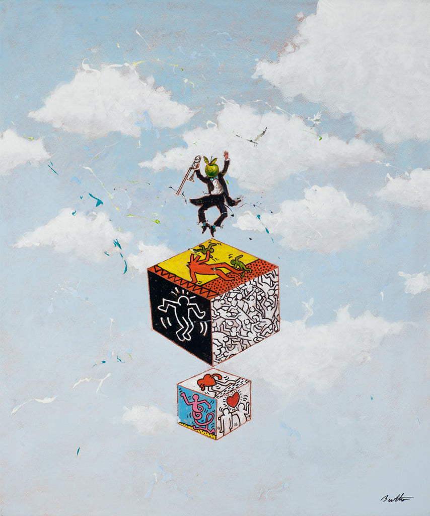 "Haring Tralala" is a digital pigment print on archival canvas created by Philippe Bertho in 2024. From the edition of 237, the artwork is signed 'Bertho' lower right and annotated lower left. The canvas size is 24 x 20" and the artwork is framed in a contemporary white frame. The artwork ships framed and accompanied by a certificate of authenticity.