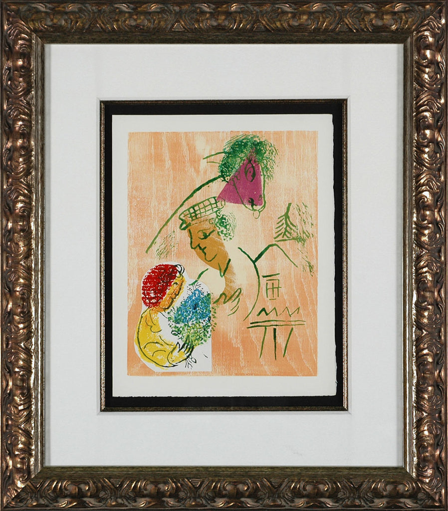 "David (#18)" from Marc Chagall's 'Poèmes', 1968. This artwork is a color woodcut on Rives wove paper from the edition of 238. The image size is 13 x 10" and the artwork is framed in an ornate, gold-tone frame. The artwork ships framed and accompanied by a certificate of authenticity.