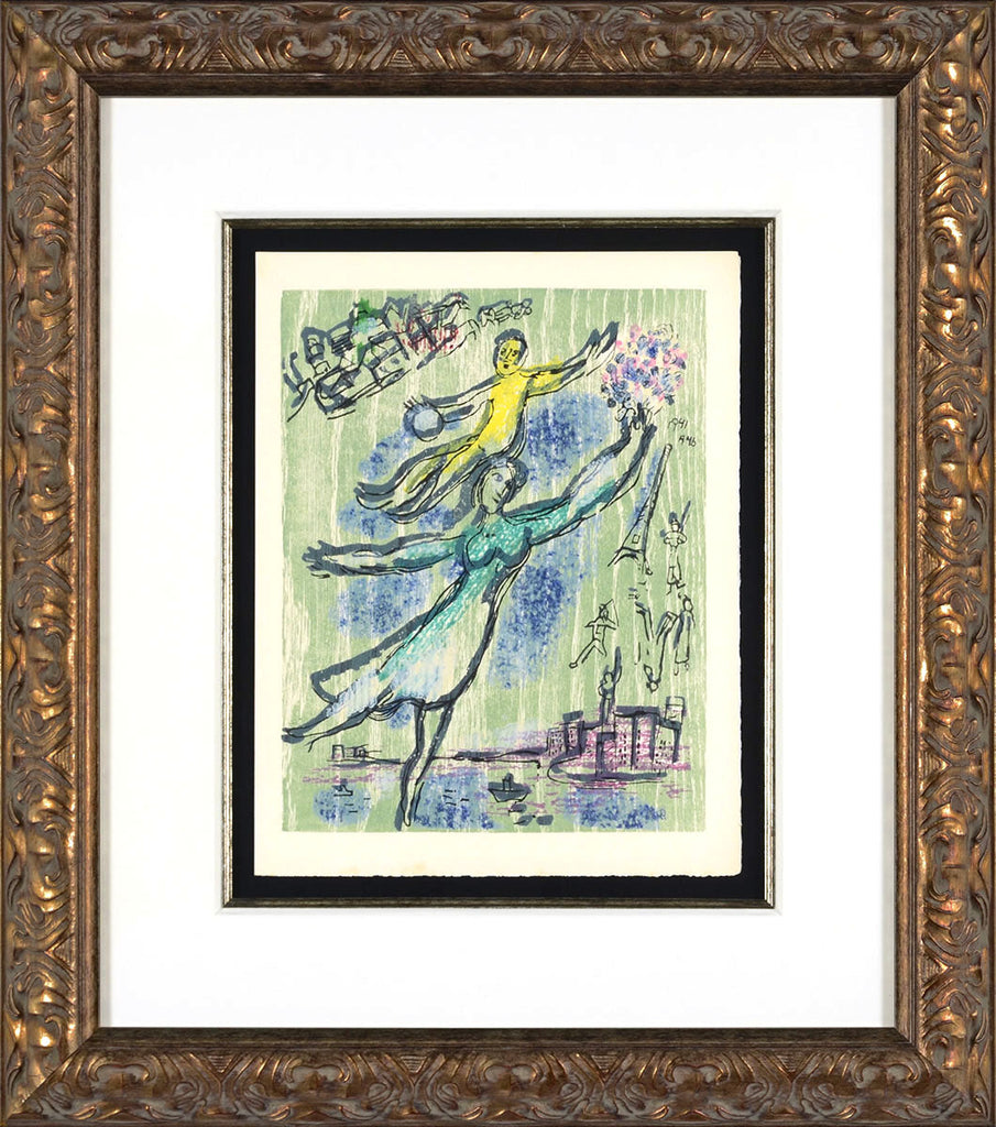 "Répit (#9)" from Marc Chagall's 'Poèmes', 1968. This artwork is a color woodcut on Rives wove paper from the edition of 238. The image size is 13 x 10" and the artwork is framed in an ornate, gold-tone frame. The artwork ships framed and accompanied by a certificate of authenticity.