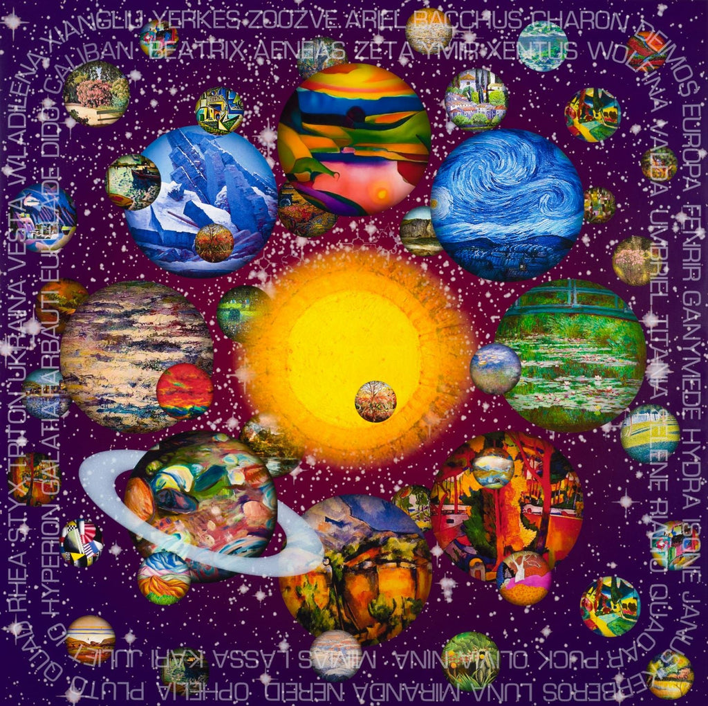 Brad Faine brings our beautiful solar system to life with imaginative pairings of great landscape paintings with our many planets and moons. The eight major planets circle around a glowing sun by Van Gogh. The Earth and our Moon are graced by images of Monet’s water lilies and the rest of the planets are (Mercury) Georgia O'Keeffe, (Venus) Vincent van Gogh, (Mars) Andre Derain, (Jupiter) Paul Cezanne, (Saturn) Edvard Munch, (Uranus) Jan Toorop and (Neptune) Casper David Friedrich. Additional landscape paintings represent some of the 286 moons and dwarf planets in our system, and A- Z text around the border lists many of their most famous names. The background image is taken from a NASA photograph of the solar system.