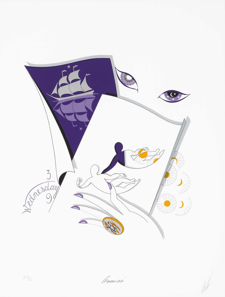"Gemini" is a serigraph created by Erté in 1982 for his 'Zodiac' suite. From the edition of 475, the artwork is signed 'Erté' lower right. The image size is 25.5 x 20". The artwork ships framed and accompanied by a certificate of authenticity.