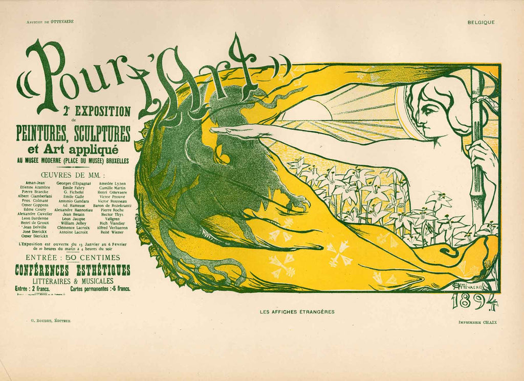 "Pour l'Art" is an 1897 chromolithograph of Henri Ottevaere's poster, printed at Imprimerie Chaix under the direction Ernest Maindron and G. Boudet for the lauded poster collection 'Les Affiches Illustrées.’ From Volume III of ‘Les Affiches Illustrées,’ a total of 1,050 portfolios were published, consisting of 1,000 prints on Vélin, 25 on Japon, and 25 on Chine. The sheet size is 12 x 9”. The artwork ships framed and accompanied by a copy of the publisher’s documentation. Please contact the gallery regarding available frame options.