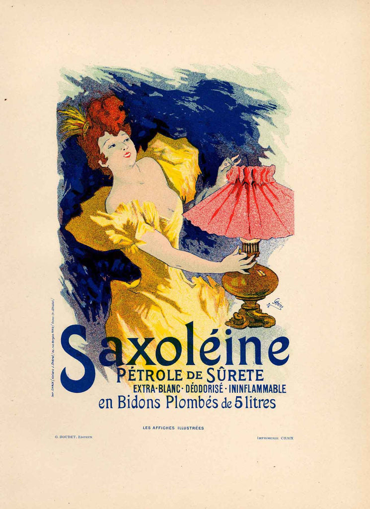 "Saxoleine” is an 1886 chromolithograph of Jules Chéret's poster, printed at Imprimerie Chaix under the direction Ernest Maindron and G. Boudet for the lauded poster collection 'Les Affiches Illustrées.’ From Volume I of ‘Les Affiches Illustrées,’ a total of 525 portfolios were published, consisting of 500 prints on Vélin and 25 on Japon. The sheet size is 12 x 9”. The artwork ships framed and accompanied by a copy of the publisher’s documentation. Please contact the gallery regarding available frame options.