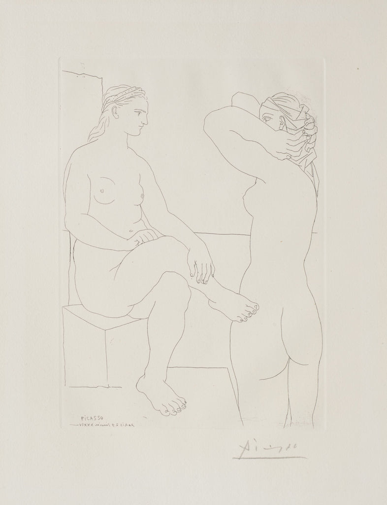 "Two Nudes" is a study in duality: of postures, emotional registers, and artistic intent. It stands as a quiet masterwork within the 'Vollard Suite', offering a moment of raw visual dialogue between two female forms. The relationship between them, ambiguous yet charged, reinforces the suite’s broader themes of creation, contemplation, and erotic complexity. It is a testament to Picasso’s ability to distill layered emotional narratives into a single, concise image, and a vital contribution to one of the most significant print cycles of the twentieth century