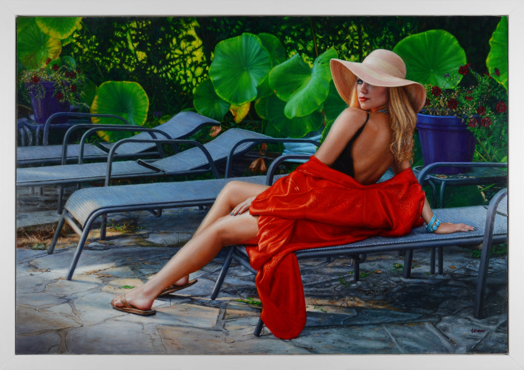 "Days of Summer" is an oil on panel painting created by Douglas Hofmann in 2017. The painting is signed 'HOFMANN' lower right. The image size is 36 x 52" and the artwork is framed in a contemporary white frame. The artwork ships framed.