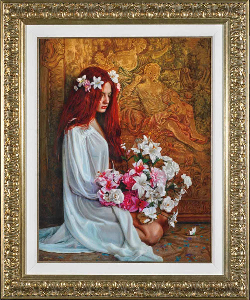 "Grace" is a archival pigment print on canvas created by Douglas Hofmann in 2012. From the edition of 325, the artwork is signed 'HOFMANN' lower right and annotated lower left. The canvas size is 32 x 25" and the artwork is framed in a ornate, gold-tone frame. The artwork ships framed and accompanied by a certificate of authenticity.