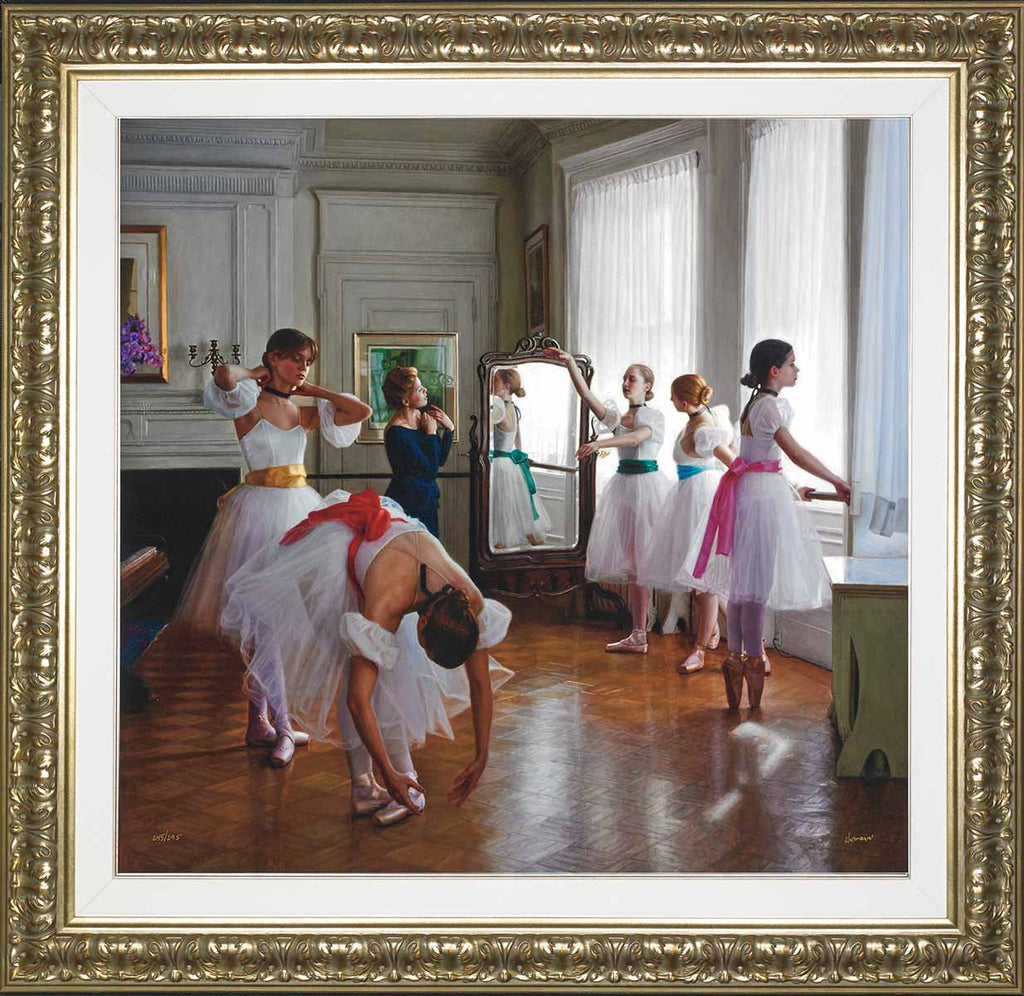 Douglas Hofmann was born in Baltimore, Maryland in 1945 and began his training in art after high school at the Maryland Institute of Art. During his first year there he discovered Joseph Sheppard who would be significant mentor and influence throughout his career. He began studying with Sheppard, taking on anatomy, drawing and painting from the model, all of which were new to Hofmann. There he also discovered the Maroger method, which enables the artist to use thin layers of paint and techniques similar to those of the Old Masters. Through his burgeoning interest in the Old Masters, Hofmann began to develop his individual taste. Emulating Vermeer, he painted situations from his home and studio using his wife and children as his models. Hofmann later expanded his subject matter to include his memorable nudes and his much-loved ballet works. Though his subjects have changed over the years, women have always dominated his panels and prints.