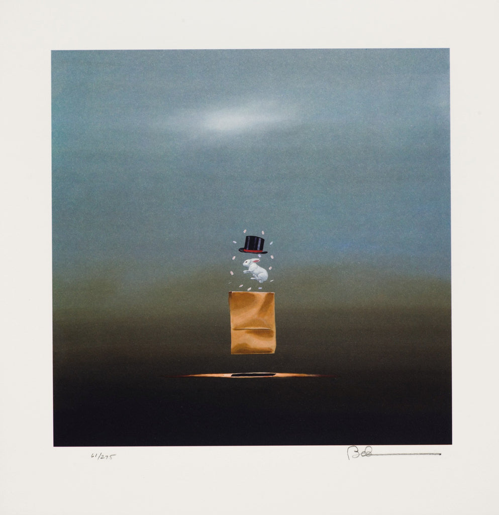 "Bag of Tricks" is a lithograph on paper created by Robert Deyber in 2007. From the edition of 395,the artwork is initialed 'BD' lower right and annotated lower left. The image size is 7.25 x 9" and the artwork is framed in a contemporary, silver-tone frame. The artwork ships framed and accompanied by a certificate of authenticity.