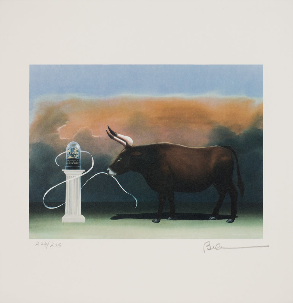"Bull Market IV (Ticker Tape)" is a lithograph on paper created by Robert Deyber in 2021. From the edition of 395,the artwork is initialed 'BD' lower right and annotated lower left. The image size is 6.75 x 9" and the artwork is framed in a contemporary, silver-tone frame. The artwork ships framed and accompanied by a certificate of authenticity.