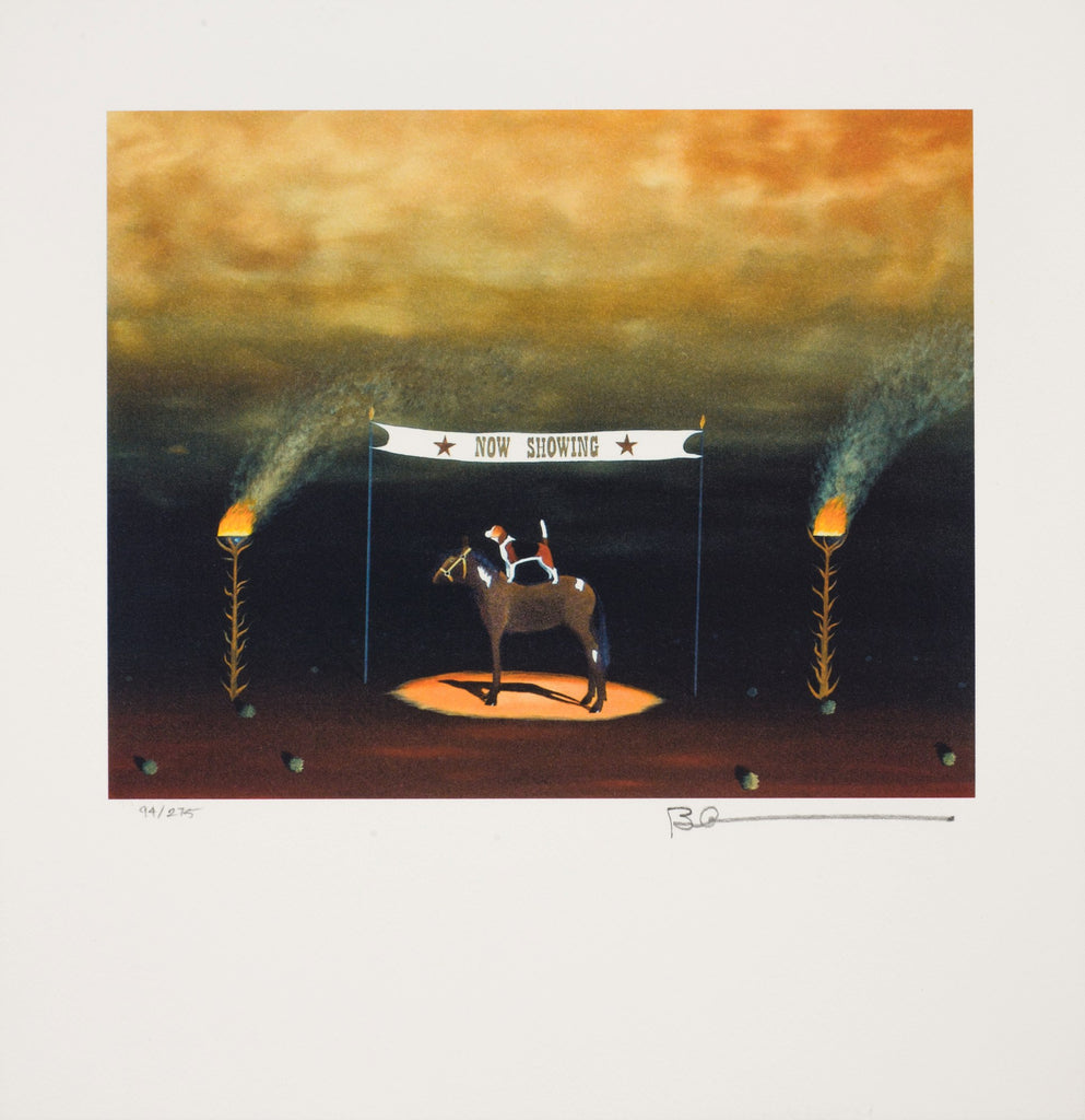 "The Dog and Pony Show" is a lithograph on paper created by Robert Deyber in 2007. From the edition of 395,the artwork is initialed 'BD' lower right and annotated lower left. The image size is 7.5 x 9" and the artwork is framed in a contemporary, silver-tone frame. The artwork ships framed and accompanied by a certificate of authenticity.