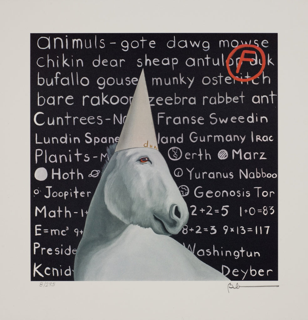 "Dumb Ass II" is a lithograph on paper created by Robert Deyber in 2018. From the edition of 395,the artwork is initialed 'BD' lower right and annotated lower left. The image size is 9.25 x 9" and the artwork is framed in a contemporary, silver-tone frame. The artwork ships framed and accompanied by a certificate of authenticity.