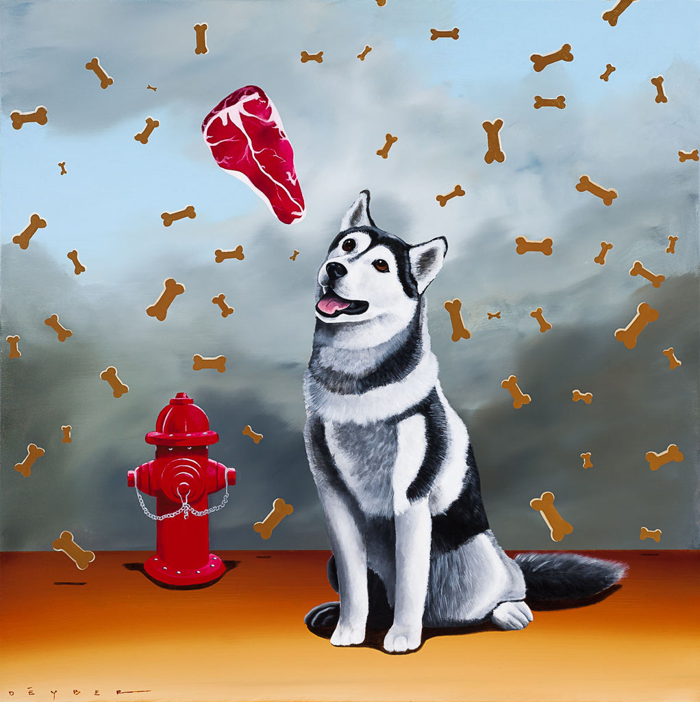 "Every Dog Has Its Day" is an acrylic on canvas painting created by Robert Deyber in 2021. The artwork is signed 'DEYBER' lower left. The canvas size is 40 x 40" and the artwork is framed in a contemporary black frame. The artwork ships framed.