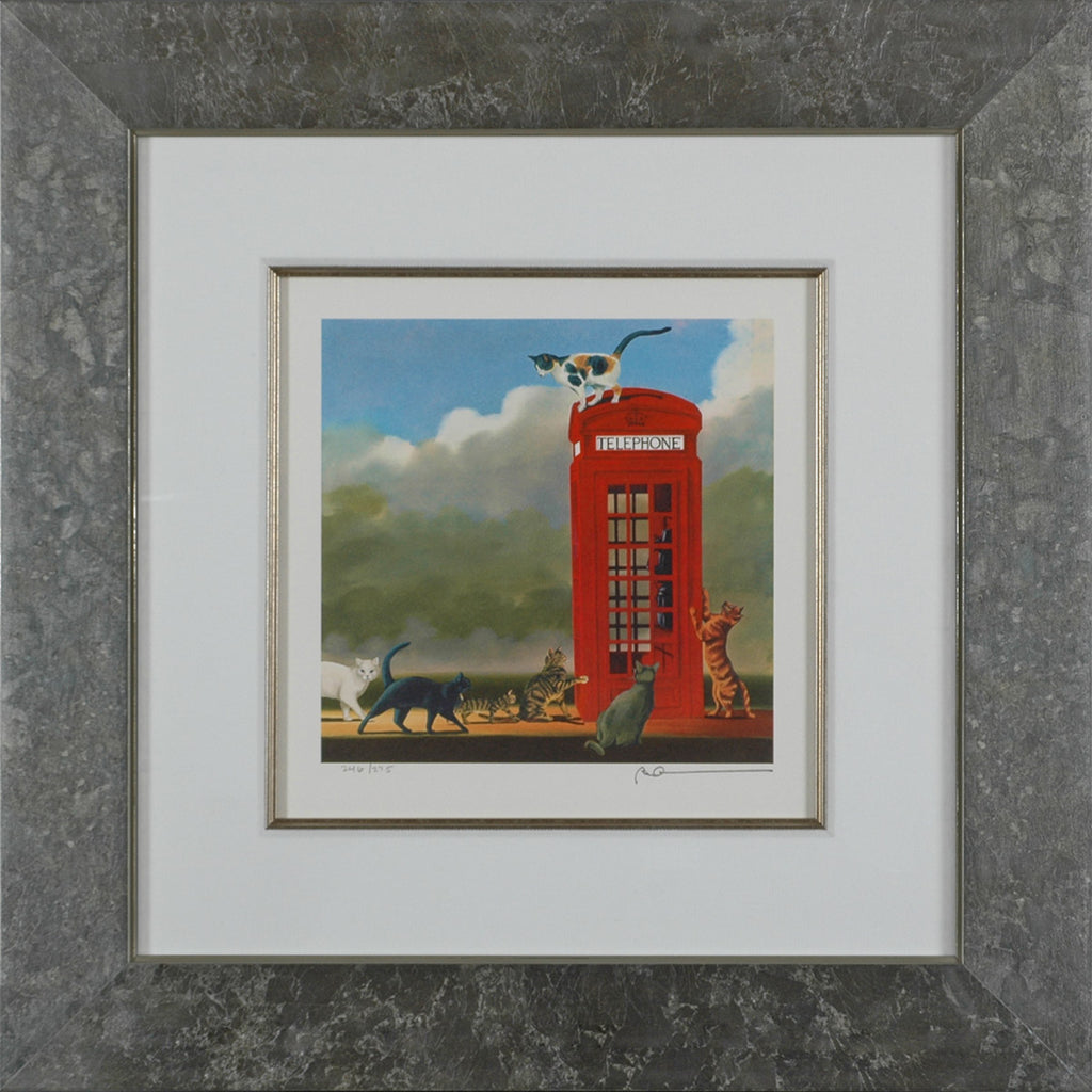 “Cat Call” is a humorous approach to a popular pun. In Deyber’s “Cat Call” we are introduced to a group of cats trying to climb into a classic British style telephone booth. They are obviously trying to make a very important call (unlike the actual usage of the phrase ‘cat call’). “Cat Call” is a 9 x 9 – inch hand signed lithograph.