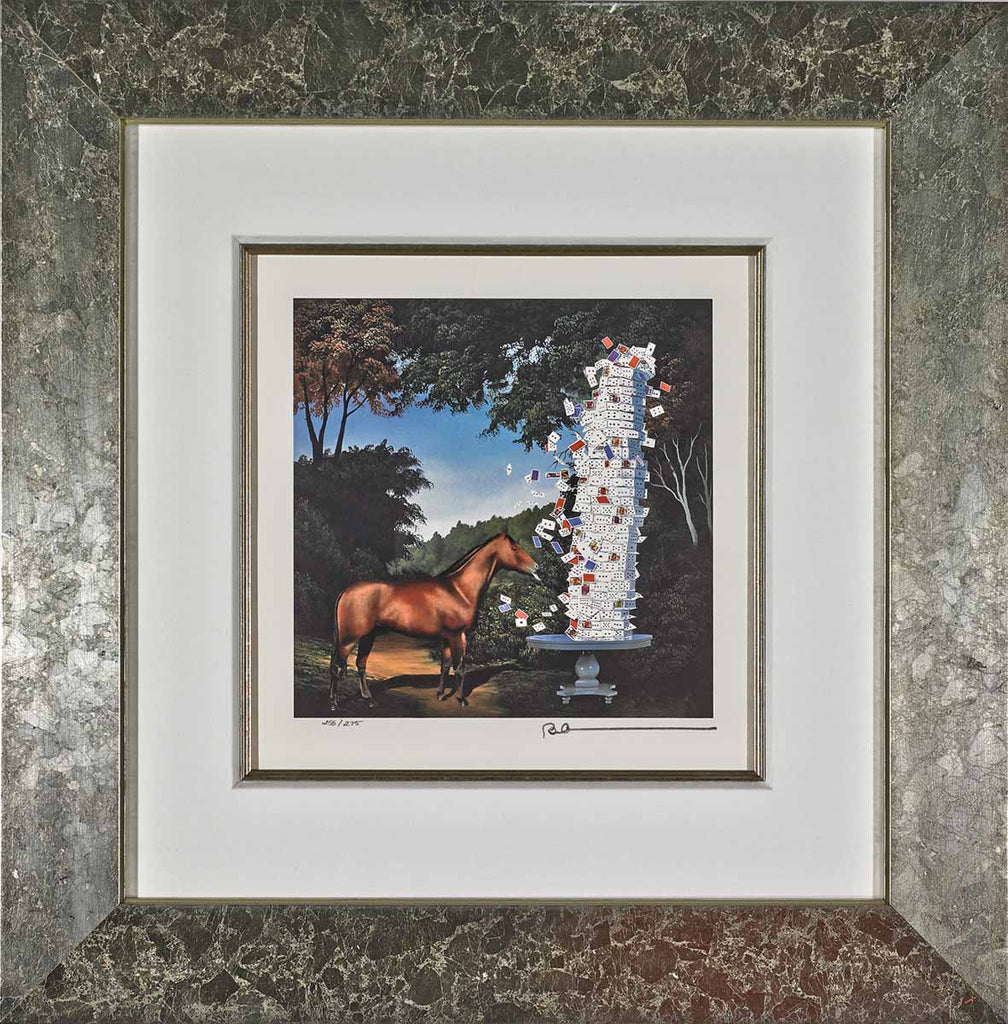 “Hobby Horse” is a classical Robert Deyber surrealistic artwork with a horse building a card pyramid which seems to be his hobby. ‘Hobby Horse” is a lithograph created in 2010. “Chalk & Vermilion” and “Art Estampe” of Paris, came together and used a centuries-old traditional method of stone lithography to ensure that the “Hobby Horse” lithograph remains faithful to the artist’s vision. “Hobby Horse” is a 9.5 x 9 – inch hand-signed lithograph created in 2009. Each lithograph is hand-pulled in an edition of 395 and initialed by the artist.