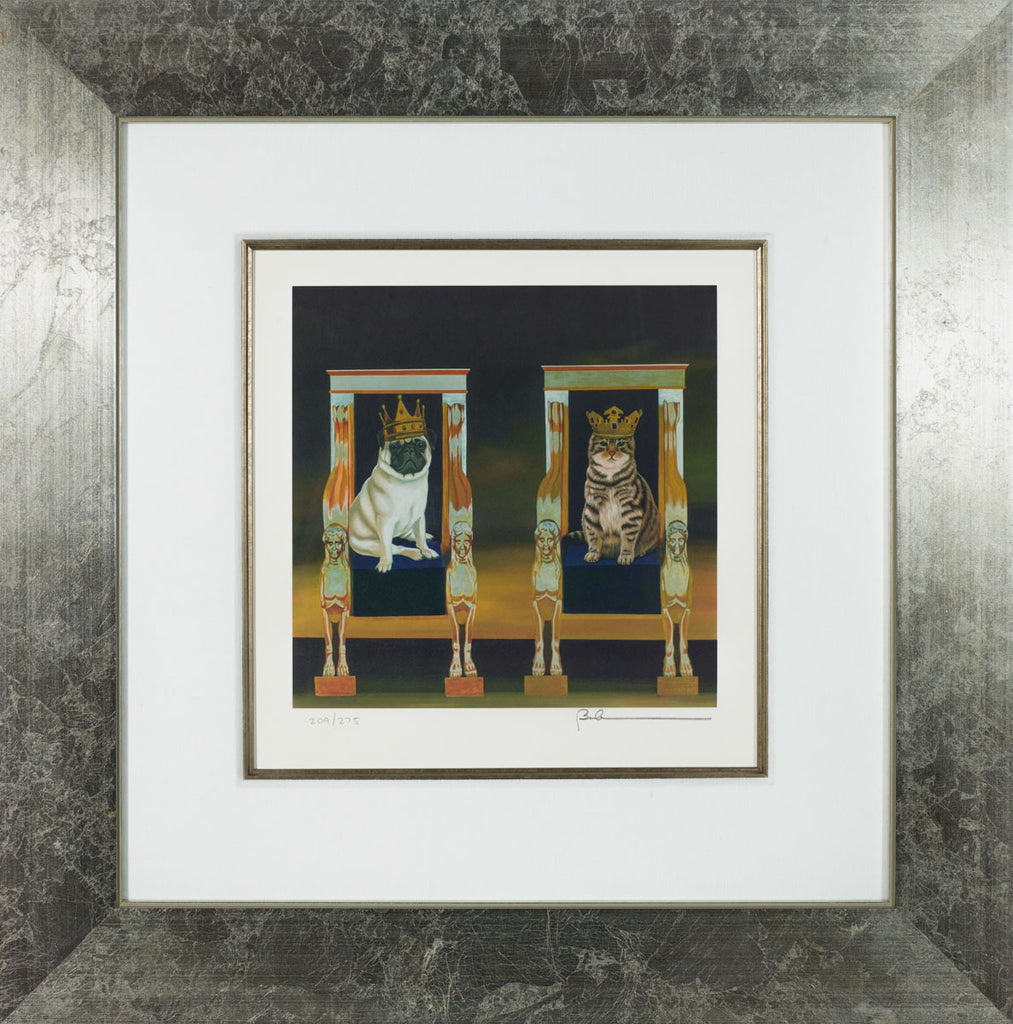 The “Reigning Cats and Dogs” title is a twist on “Raining Cats and Dogs”. However, in Deyber’s universe cats and dogs reign supreme! “Reigning Cats and Dogs” is a 9 x 9 – inch hand signed lithograph.