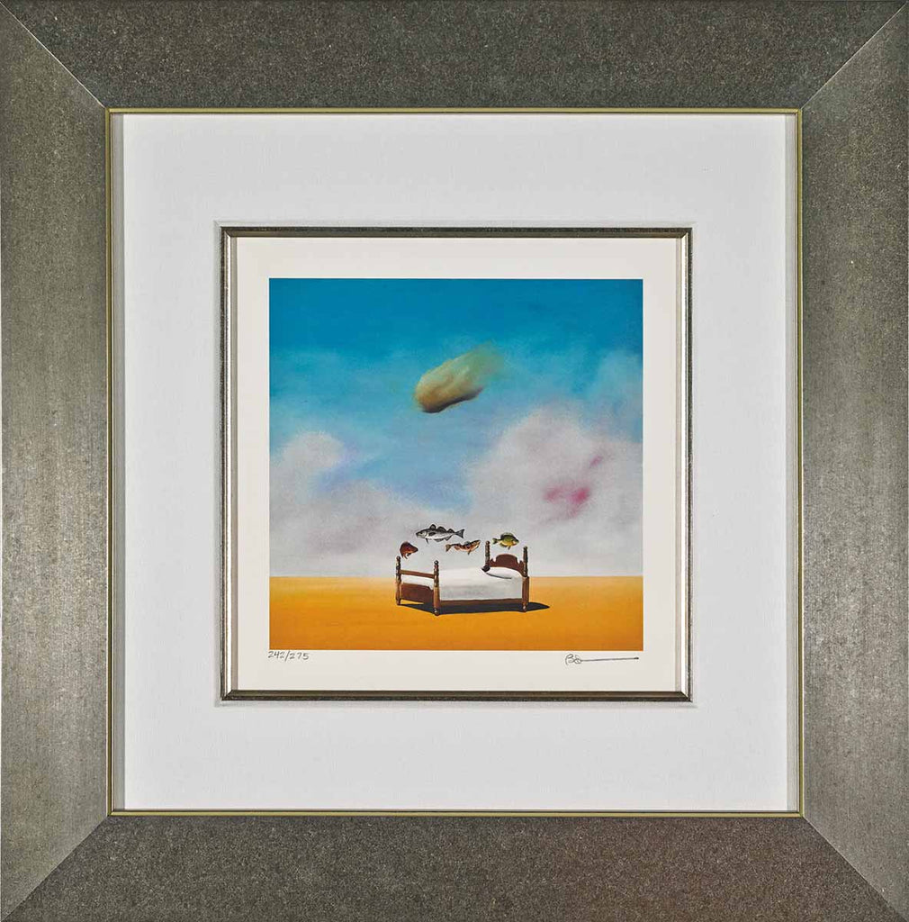 “Sleeping with Fishes” is a classical Robert Deyber surrealistic artwork that depicts fishes flying on top of a bed. “Chalk & Vermilion” and “Art Estampe” of Paris, came together and used a centuries-old traditional method of stone lithography to ensure that the “Sleeping with fishes” lithograph remains faithful to the artist’s vision. ”Sleeping with fishes” is a 9.5 x 9 – inch hand-signed lithograph created in 2009. Each lithograph is hand-pulled in an edition of 395 and initialed by the artist.