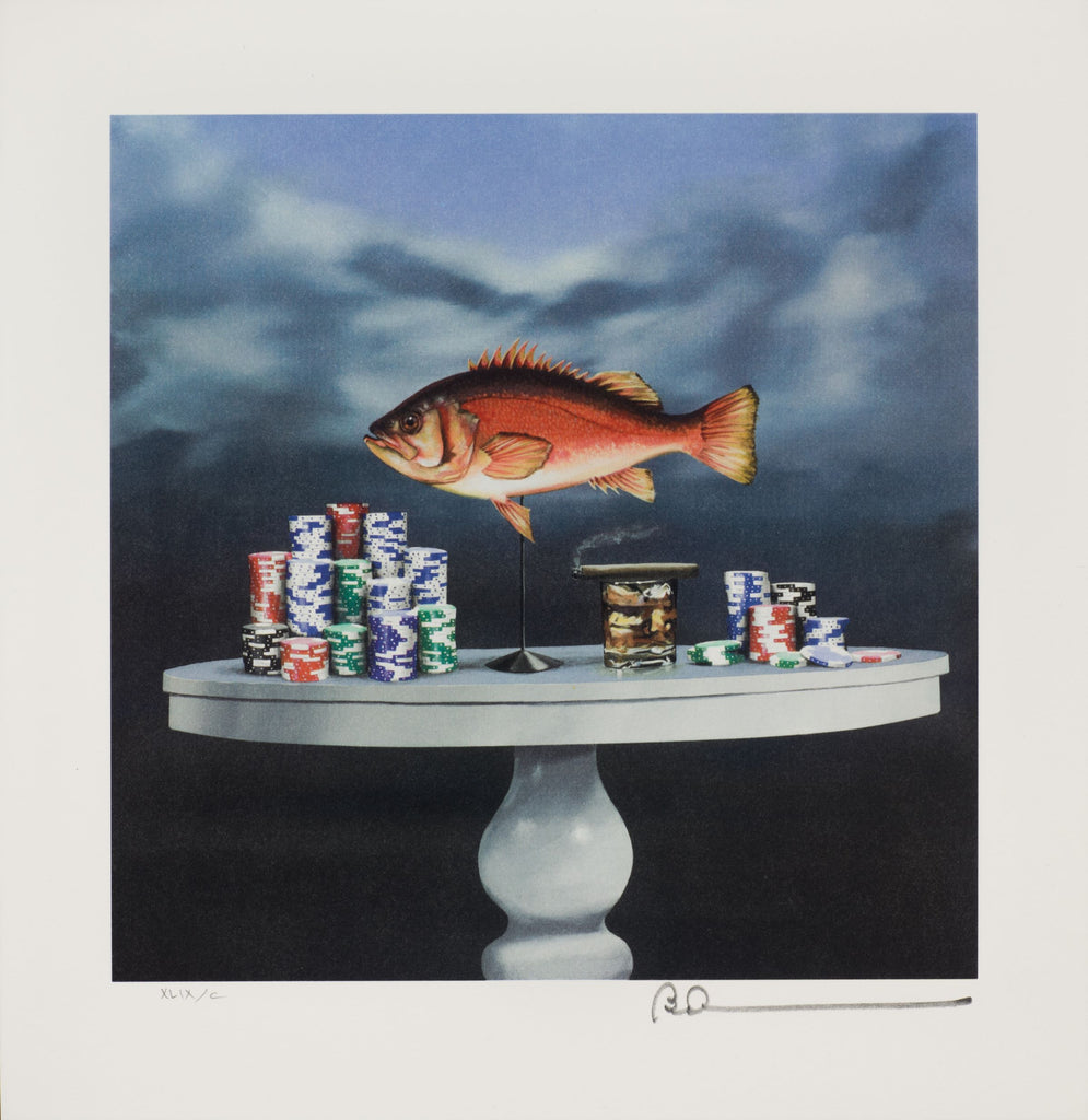 "Fish & Chips" is a lithograph on paper created by Robert Deyber in 2011. From the edition of 395,the artwork is initialed 'BD' lower right and annotated lower left. The image size is 9.5 x 9" and the artwork is framed in a contemporary, silver-tone frame. The artwork ships framed and accompanied by a certificate of authenticity.