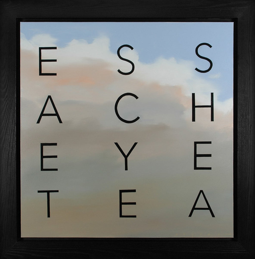 "SHIT (Dirty Words)" is an acrylic on canvas painting created by Robert Deyber in 2016. The artwork is signed 'DEYBER' lower right. The canvas size is 48 x 48" and the artwork is framed in a contemporary black frame. The artwork ships framed.