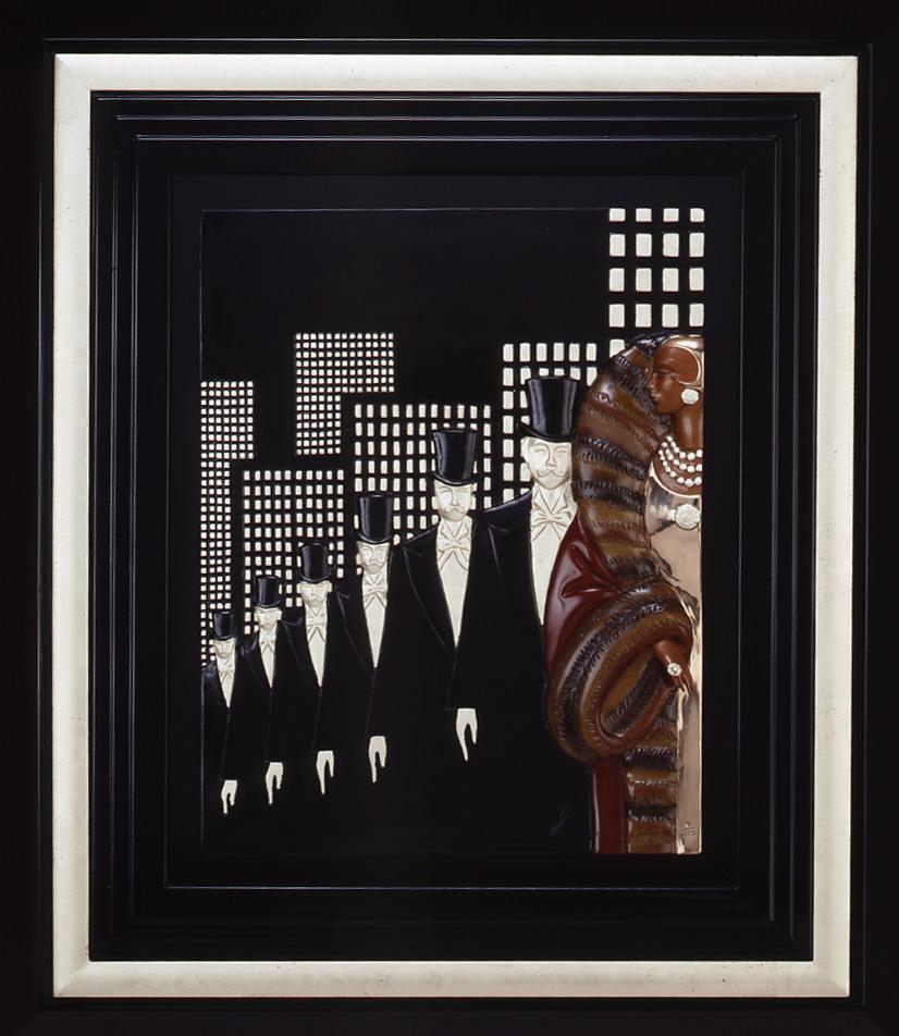 "Top Hats" is a bronze wall sculpture created by Erté. From the edition of 462, the bronze is stamped with the artists signature. The sculptures dimensions are 16 x 21 x 1" and is framed in a contemporary, black frame. The sculpture ships framed and accompanied by a certificate of authenticity.