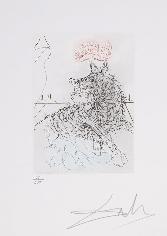 "Richard III (Plate 391)" is an etching with drypoint created by Salvador Dalí in 1971 for his 'Shakespeare II' series. From the edition of 450, the artwork is signed 'Dalí' lower right and annotated lower left. The image size is 6.75 x 5". The artwork ships framed and accompanied by a certificate of authenticity.