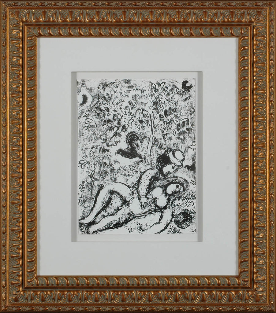 "Couple in a Tree (M.397)" is a lithograph created by Marc Chagall which was bound into Volume II of the Mourlot catalog raisonné of lithographs, printed in 1963. The total number of unsigned prints is unknown. The image size is 13 x 10" and the artwork ships framed and accompanied by a certificate of authenticity.