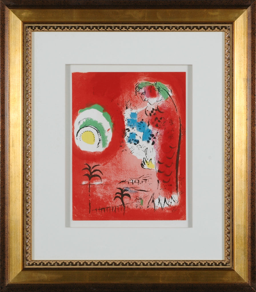 "The Bay of Angels (M.286)" is a lithograph created by Marc Chagall which was bound into Volume I of the Mourlot catalog raisonné of lithographs, printed in 1960. The total number of unsigned prints is unknown. The image size is 12.5 x 9.5" and the artwork ships framed and accompanied by a certificate of authenticity.