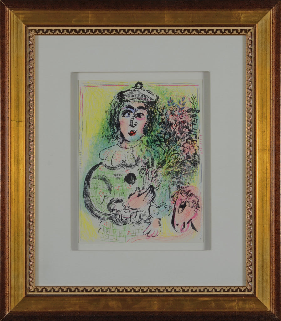 "The Clown with Flowers (M.399)" is a lithograph created by Marc Chagall which was bound into Volume II of the Mourlot catalog raisonné of lithographs, printed in 1963. The total number of unsigned prints is unknown. The image size is 12.5 x 9.5" and the artwork is framed in a classic, gold-tone frame. The artwork ships framed and accompanied by a certificate of authenticity.