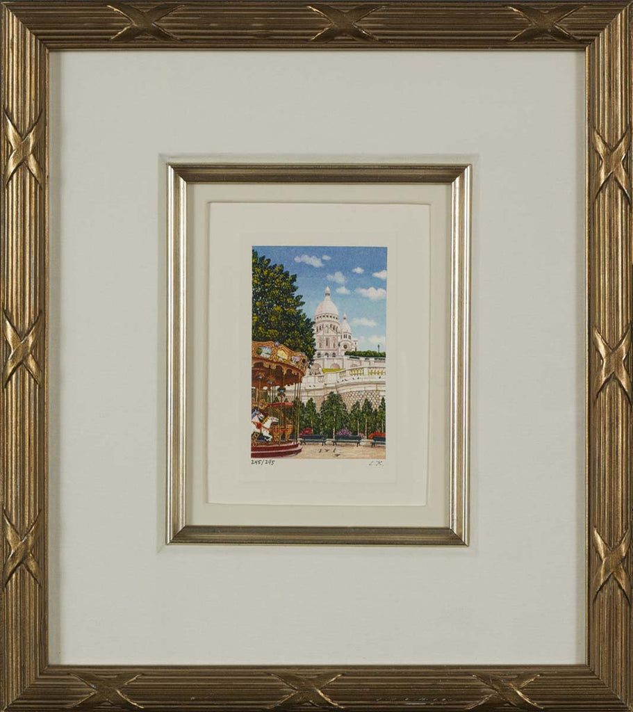 "Carousel a Sacre Coeur" is a lithograph on paper created by Liudmila Kondakova in 2006. From the edition of 325, the artwork is initialed 'L.K' lower right and annotated lower left. The image size is 4.25 x 2.75" and the artwork is framed in a classic 'reed and ribbon' gold-tone frame. The artwork ships framed and accompanied by a certificate of authenticity.