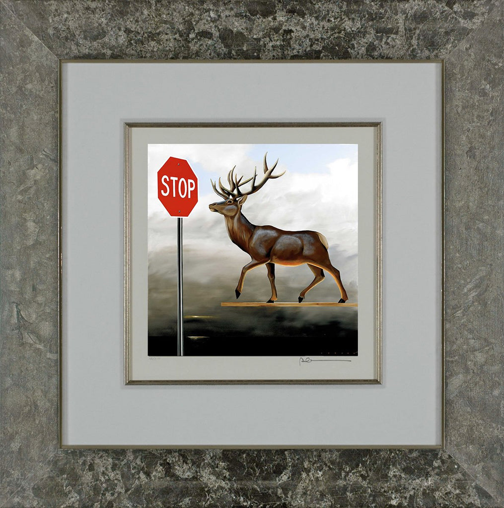 "The Buck Stops Here (Deer at Stop Sign)" is i 9 x 9-inch Robert Deyber Lithograph. "The Buck Stops Here (Deer at Stop Sign)" comes framed, signed and with a certificate of authenticity.