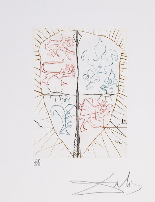 "Henry V (b) (Plate 404)" is an etching with drypoint created by Salvador Dalí in 1971 for his 'Shakespeare II' series. From the edition of 450, the artwork is signed 'Dalí' lower right and annotated lower left. The image size is 6.75 x 5". The artwork ships framed and accompanied by a certificate of authenticity.