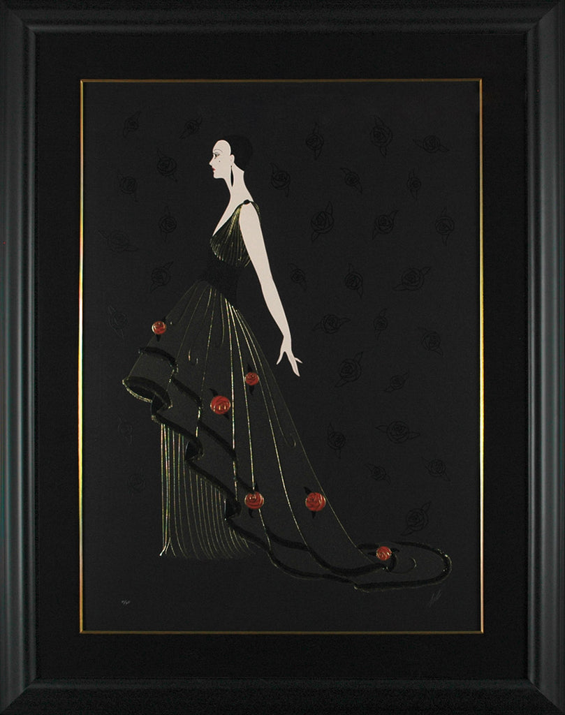 "Rose Gown" is an embossed serigraph with foil stamping created by Erté in 1989. From the edition of 649, the artwork is signed 'Erté' lower right. The image size is 30 x 23" and the artwork is framed in a contemporary, black frame. The artwork ships framed and accompanied by a certificate of authenticity.