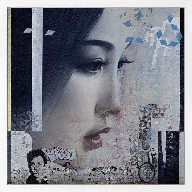 "The Here and Now" is an oil and mixed media on canvas painting created by François Fressinier in 2023. The artwork is signed 'FRESSINIER' lower left. The canvas size is 35 x 35" and the artwork ships framed in a contemporary white frame. The artwork ships framed.