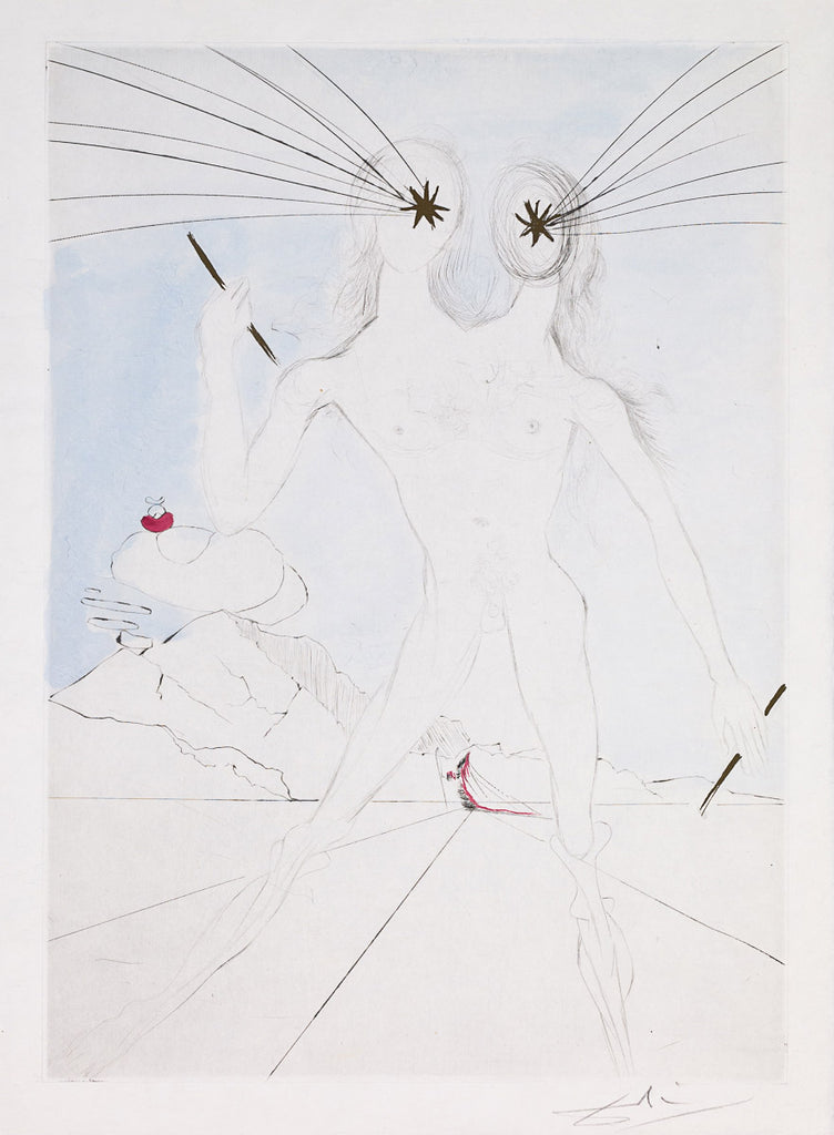 "Bicephalous" is an engraving on Japon, created by Salvador Dalí as a part of his series "Les Amours de Cassandre" in 1968. From the edition of 526, the artwork is signed 'Dalí' lower right. The image size is 13.5 x 9.75" and the artwork is framed in a ornate, gold-tone frame. The artwork ships framed and is accompanied by a certificate of authenticity.