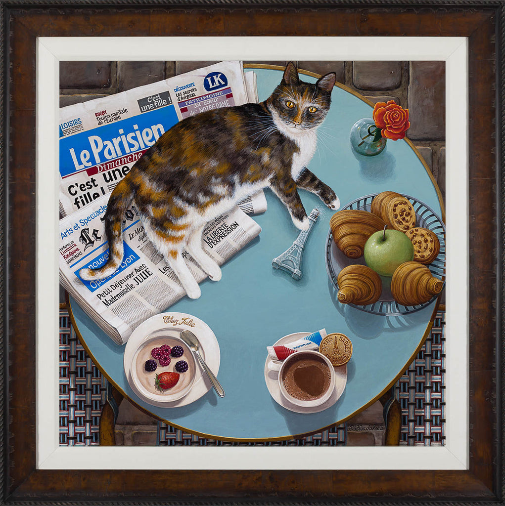 "Breakfast with Miss Julie" is a digital pigment print on canvas created by Liudmila Kondakova in 2022. From the edition of 120, the artwork is signed 'Kondakova' lower right and annotated lower left. The canvas size is 30 x 30" and the artwork is framed in a contemporary, gold-tone frame. The artwork ships framed and accompanied by a certificate of authenticity.