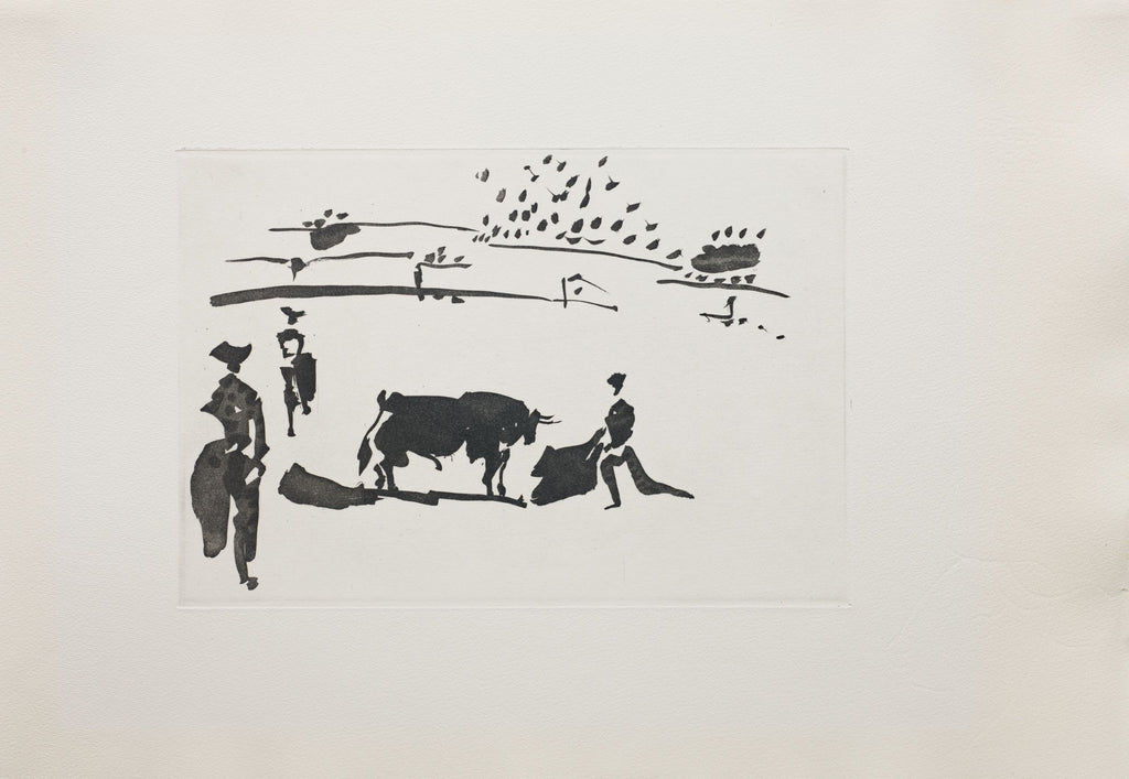 "Citando al Toro con la Capa (B.956)" is an aquatint, from the edition of 263, created by Pablo Piacsso for his "La Tauromaquia" series in 1959. The image size is 7.87 x 11.5" and the artwork is framed in a contemporary black frame. The artwork ships framed and is accompanied by a certificate of authenticity.