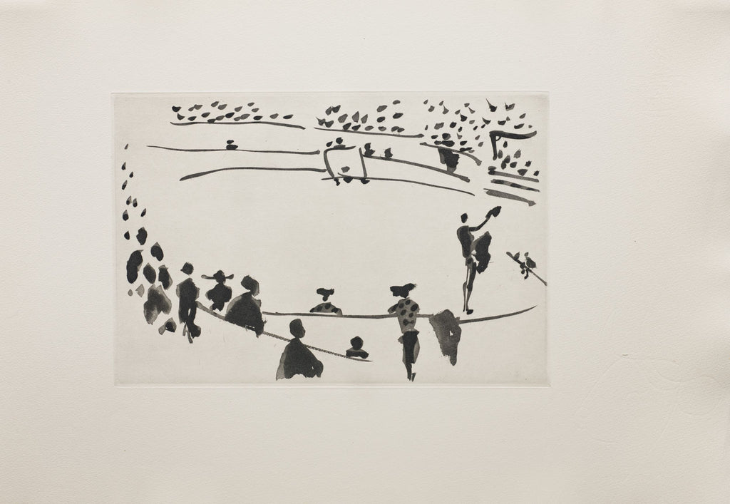 "El Matador Brinda la Muerte del Toro (B.966)" is an aquatint, from the edition of 263, created by Pablo Piacsso for his "La Tauromaquia" series in 1959. The image size is 7.87 x 11.5" and the artwork is framed in a contemporary black frame. The artwork ships framed and is accompanied by a certificate of authenticity.