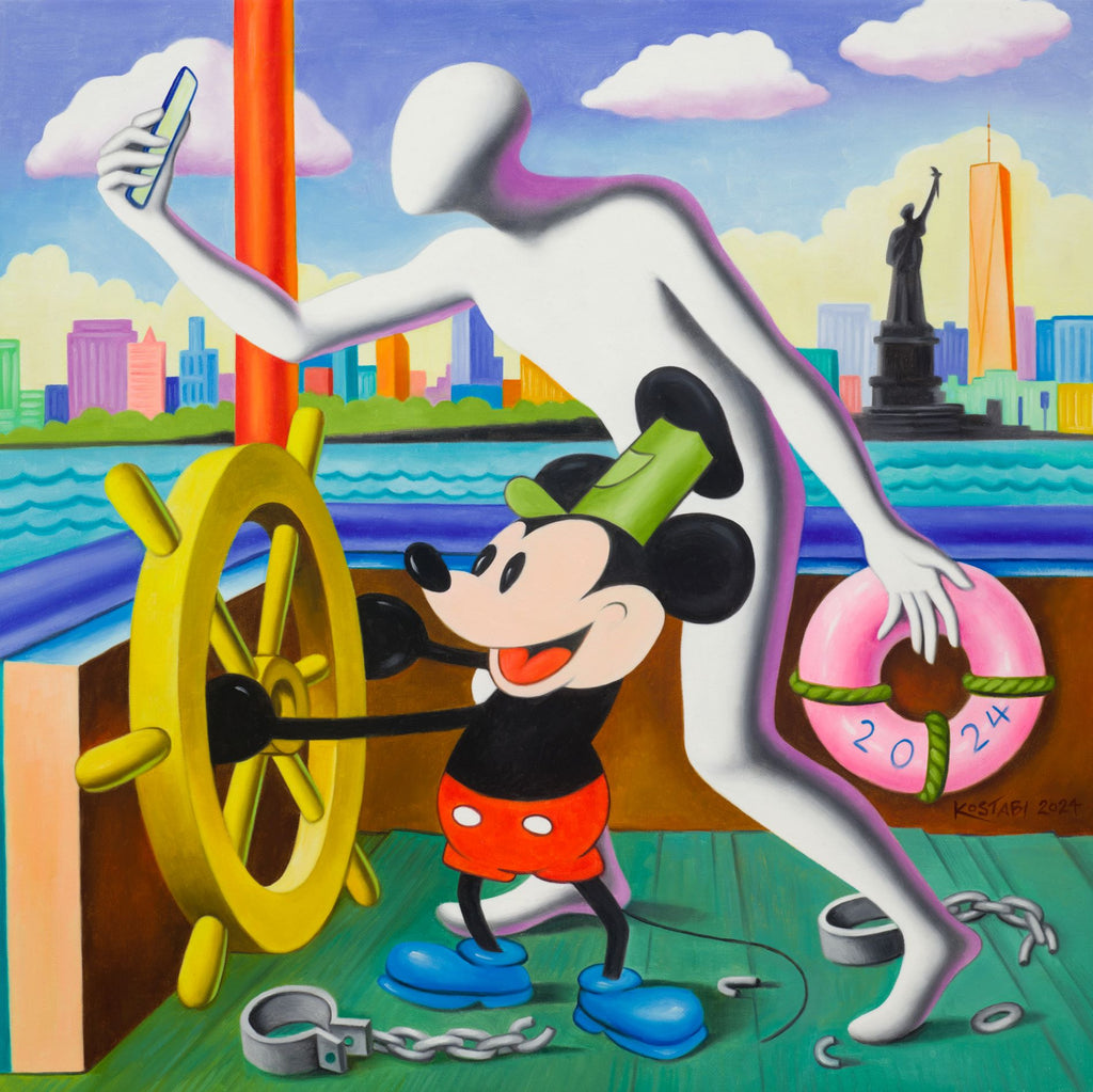 “Free At Last” is an oil on canvas painting created by Mark Kostabi in 2024. The artwork is signed and dated 'KOSTABI 2024' lower right. The canvas size is 28 x 28" and the artwork is framed in a contemporary black frame. The artwork ships framed.