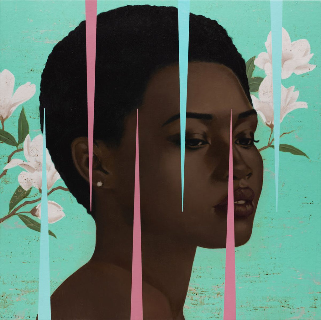 "Holding Her Own" is an oil and mixed media on canvas painting by François Fressinier. The artwork is signed 'FRESSINIER' lower left. The canvas size is 35 x 35" and the artwork is framed in a contemporary white frame. The artwork ships framed.