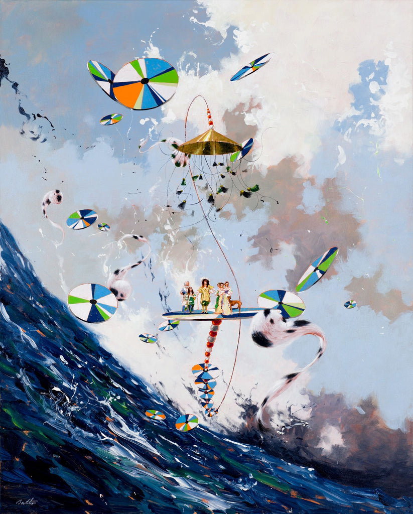 Philippe Bertho is classically trained having enrolled in art school in Reims, France in the early 1990s. There, he spent considerable time studying decorative trompe l’oeil painting. Tromp l’oeil (“to fool the eye”) is a technique used by artists to create the illusion of a 3rd dimension on a flat surface. It is obvious from Bertho’s artwork that he fools much more than the eye…he draws one in by the heart and also quite frequently by the funny bone. Despite his ability to perfectly render reproductions of masterworks, Bertho was drawn to the world of fantasy and illusion. As his style developed, he drew inspiration from renowned contemporary trompe-l’oeil artist, Jacques Poirier. In his early work, Bertho exhibited ingenuity by including unusual materials in his paintings. Employing objects that other’s found useless – corrugated iron, rusted metal boxes, old light bulbs – he was fascinated with his ability to bring his art alive by creating dimension – either by the addition of these items directly onto his canvas or later through the technique of trompe l’oeil.