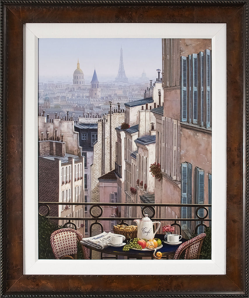 "Misty Morning" is an archival print with hand-made serigraph texture plates created by Liudmila Kondakova in 2015. From the edition of 325, the artwork is signed 'Kondakova' lower right and annotated lower left. The canvas size is 28 x 22" and the artwork is framed in a contemporary gold-tone frame. The artwork ships framed and accompanied by a certificate of authenticity.