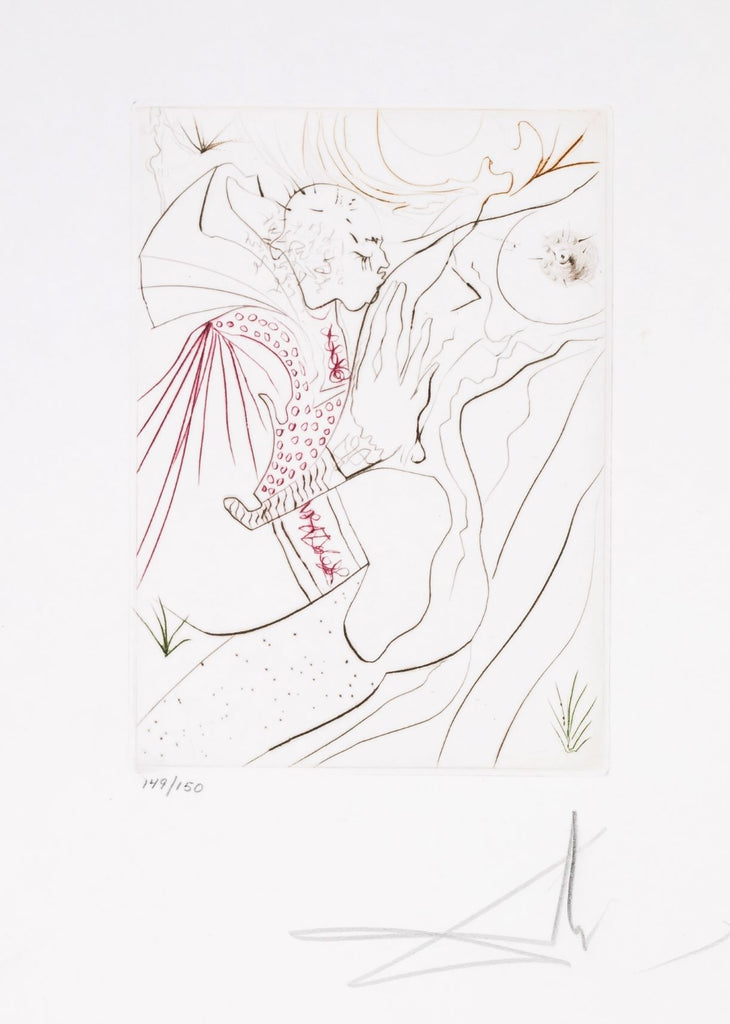 "Le Péché Partagé (Plate A)" is an etching and drypoint, created by Salvador Dalí as a part of his series 'Le Decameron' in 1972. From the edition of 725, the artwork is signed 'Dalí' lower right and annotated lower left. The image size is 6.75 x 5". The artwork ships framed and is accompanied by a certificate of authenticity.